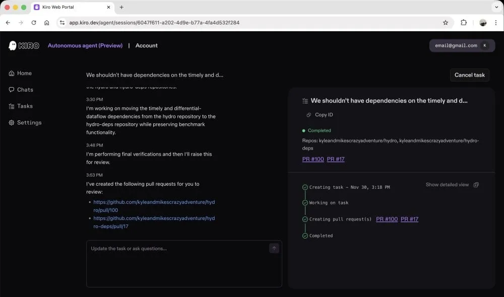 - Kiro autonomous agent: ปัญญาประดิษฐ์เขียนโค้ดแบบทำงานจากคำสั่งและกลับมาเป็น pull request สามารถอ่าน Jira, GitHub, และ Slack ได้ในตัว ตอนนี้เปิดให้ใช้เฉพาะผู้สมัครแพ็กเกจ Pro ขึ้นไปเท่านั้น แต่เมื่อสมัครแล้วจะใช้งานได้ฟรีในช่วงพรีวิว