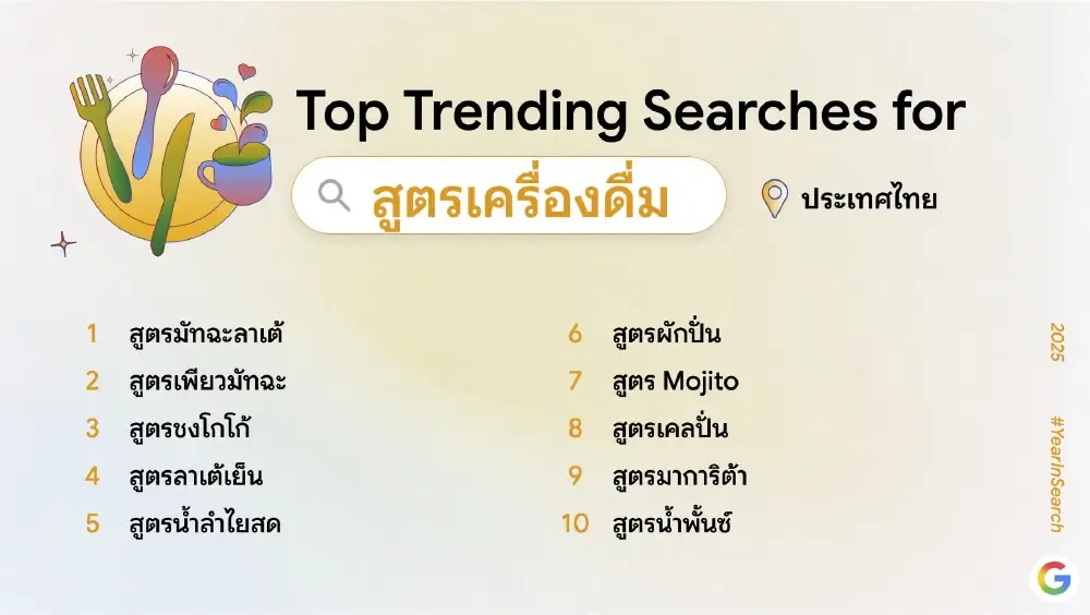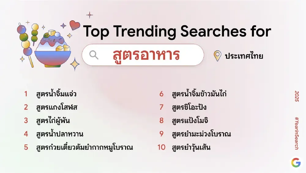 รวมถึงกิจกรรมยอดนิยมอย่างสูตรอาหาร วิธีทำ และหมวดความบันเทิงที่ครองใจผู้ค้นหาตลอดทั้งปี ผลลัพธ์ทั้งหมดสะท้อนจังหวะการเปลี่ยนแปลงของพฤติกรรมผู้ใช้อย่างรอบด้าน