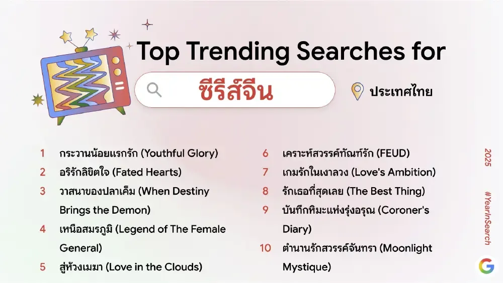 ผลการค้นหายอดนิยมประจำปี 2568 สะท้อนให้เห็นถึงรสนิยมและความหลากหลายด้านความบันเทิงของผู้ชมชาวไทย ซึ่งยังคงให้ความสนใจกับเนื้อหาหลากหลายแนว ทั้งเรื่องราวเข้มข้น พีเรียด ดราม่า แฟนตาซี ไปจนถึงการกลับมาของซีรีส์ระดับโลกที่ถูกพูดถึงอย่างกว้างขวาง