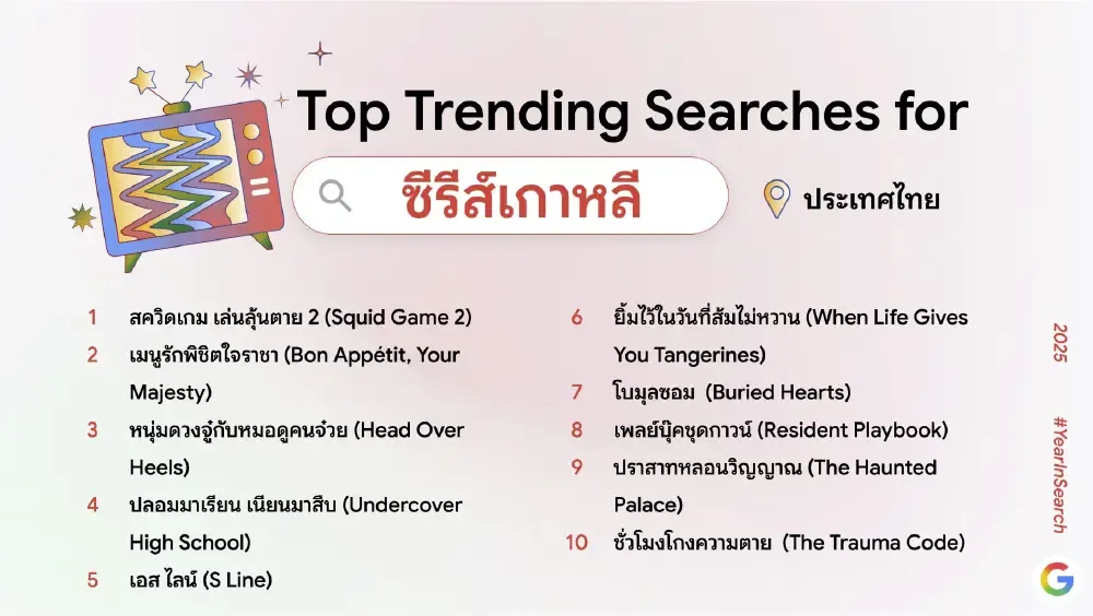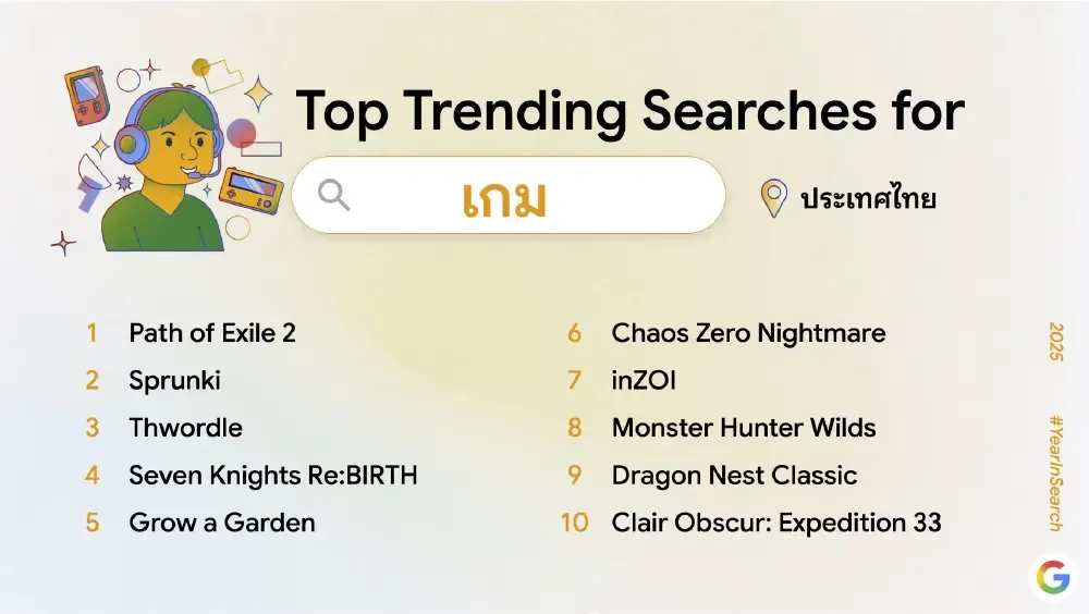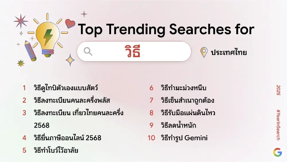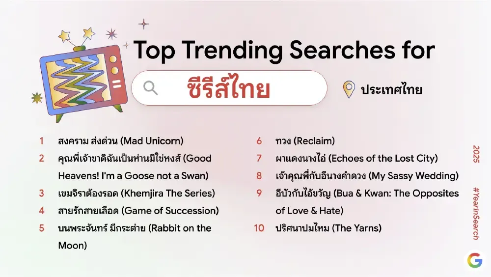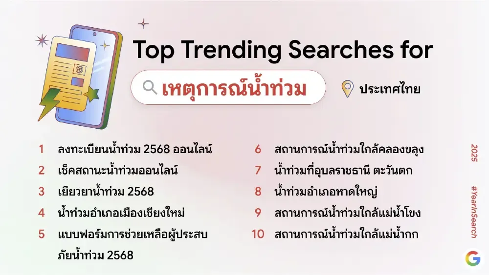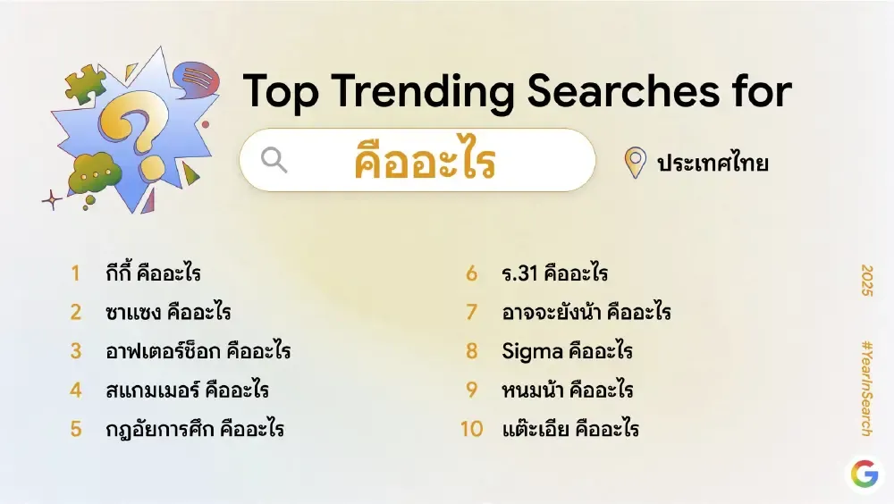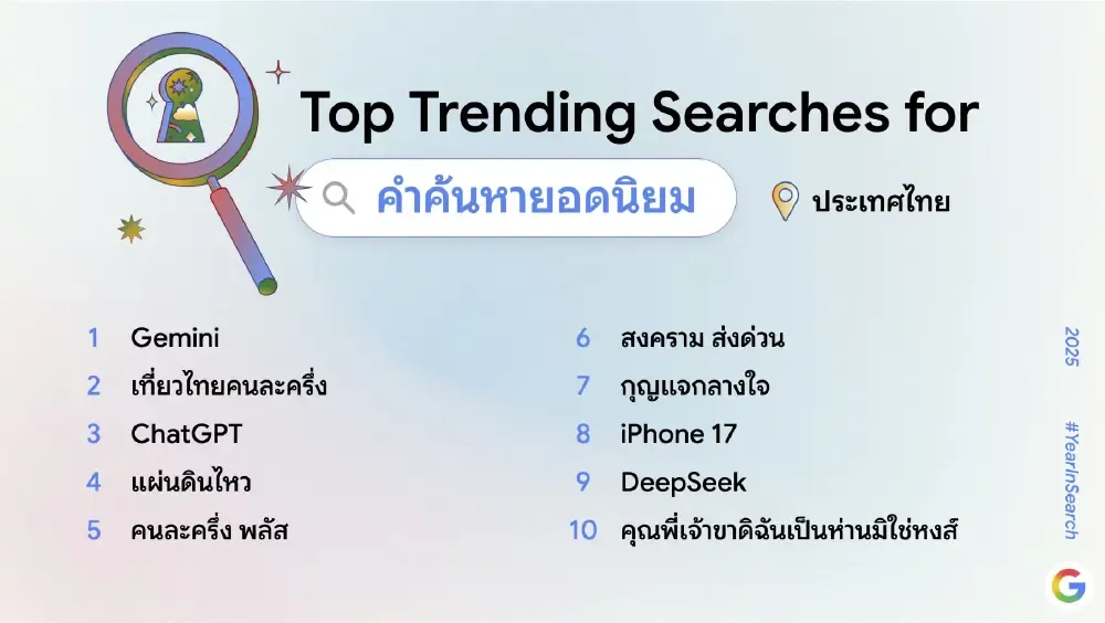 ผลการค้นหายอดนิยมปีนี้สะท้อนให้เห็นถึงการผสานกันของเทรนด์เทคโนโลยี เหตุการณ์สังคม และความบันเทิงที่ต่างมีบทบาทสำคัญในการขับเคลื่อนความสนใจของคนไทยตลอดทั้งปี
