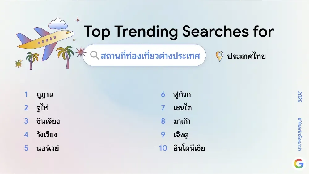 ด้านหมวดสถานที่ท่องเที่ยวต่างประเทศ เทรนด์การค้นหาในปีนี้ชี้ให้เห็นถึงการ “ออกนอกกรอบ” ของนักเดินทางไทย ที่เลือกจุดหมายใหม่ๆ เพื่อประสบการณ์ที่ไม่ซ้ำใคร โดย “ภูฏาน” ครองอันดับ 1 ด้วยเสน่ห์ของธรรมชาติและวัฒนธรรมอันโดดเด่น ตามด้วย “จูไห่” “ซินเจียง” “วังเวียง” “นอร์เวย์” “ฟูก๊วก” “เซนได” “มาเก๊า” “เฉิงตู” และ “อินโดนีเซีย” ตามลำดับ ซึ่งสะท้อนความสนใจที่หลากหลายมากยิ่งขึ้น ทั้งสายแอดเวนเจอร์ สายวัฒนธรรม และสายตามหาภูมิประเทศแปลกใหม่