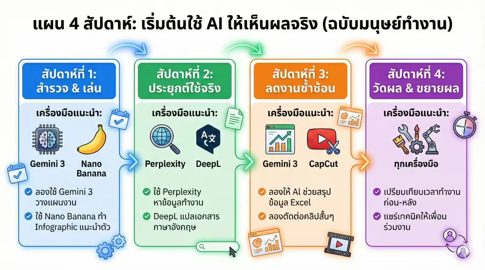 ตารางสรุป: เริ่มต้นใช้ AI อย่างไรให้เห็นผลใน 4 สัปดาห์?