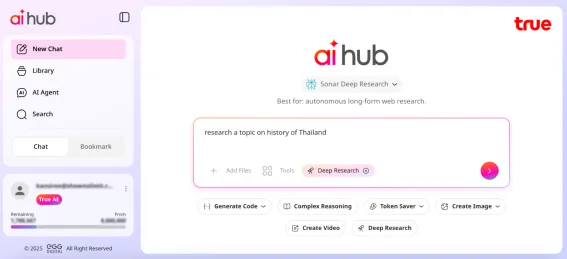 ประการแรกที่ True AI Hub ทำได้ดีคือใช้งานสะดวกและง่าย เวลาเซิร์ชข้อมูลเราสามารถเลือกได้เลยว่าจะใช้ AI จากค่ายไหน ไฮไลต์ที่เจ๋งคือตัวแพลตฟอร์มจะแนะนำมาให้อยู่แล้วว่าในหัวข้อที่เราต้องการหาข้อมูลควรเลือกใช้ AI ตัวไหนบ้าง เช่น ถ้าเราคลิกเลือกโหมดค้นคว้าเชิงลึก (Deep Research) ระบบจะแนะนำโมเดล Sonar Deep Research ของ Perplexity ให้โดยอัตโนมัติ หรือถ้าเราคลิกโหมดสร้างรูปภาพ (Create Image) ระบบจะแนะนำ Nano Banana มาให้ เป็นต้น ทั้งนี้เราสามารถเลือกโมเดลที่ต้องการใช้ได้เองเช่นกัน
